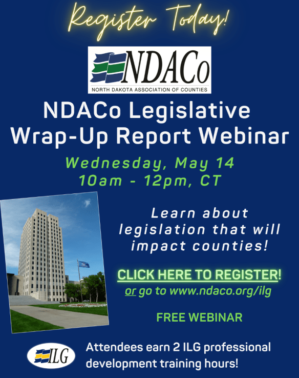 Stay tuned for a more detailed report summarizing the entire 69th Legislative Session and county-related bills. Make sure to register for the ND Legislative Wrap Up – May 14th!
